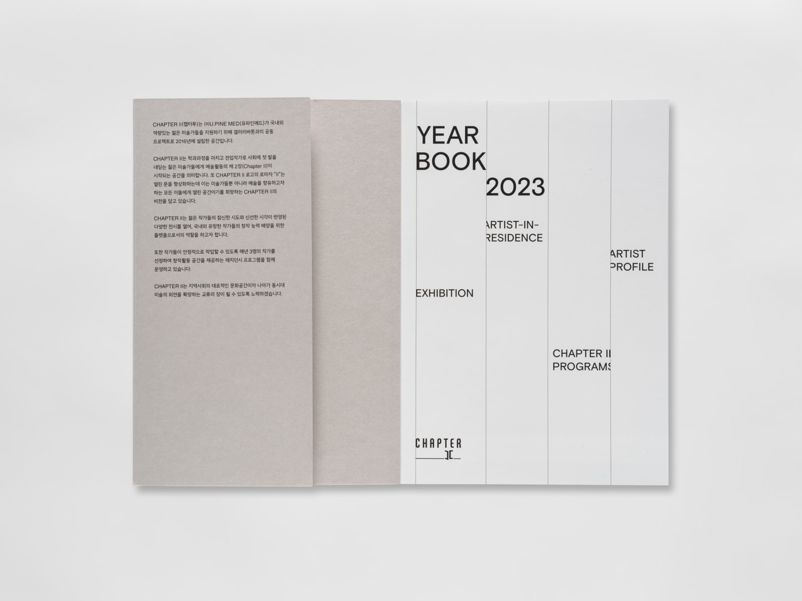 The '2023 Chapter II Yearbook,' containing records of Chapter II's activities throughout 2023, has been published. The Yearbook includes exhibitions, resident artist introductions, program photos, and more from Chapter II held over the past year.This Yearbook was designed by Hong Ju Hee, a designer and the selected artist of the 7th Chapter II residency.